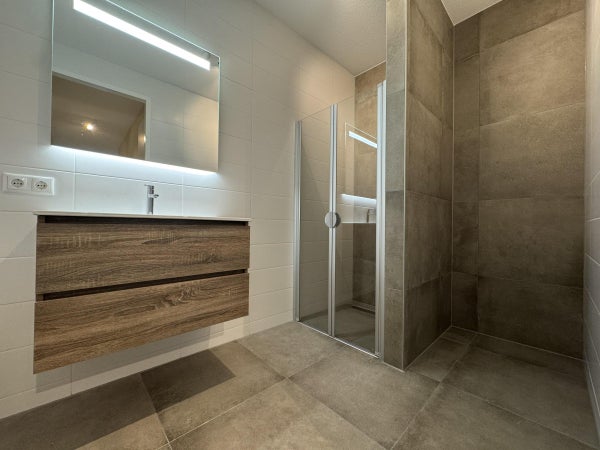 Il bagno è moderno e dotato di doccia a pioggia e mobile lavabo. Inoltre, c’è un bagno separato.