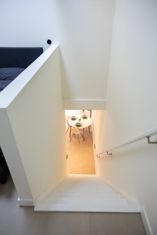 Le foto riguardano un appartamento al 21F, disponibile immediatamente. L'unità ha una superficie di 50 m² e dispone di un soggiorno con cucina a vista, una camera da letto e un bagno con WC. L'unità si trova al piano terra e la camera da letto è raggiungibile tramite una scala al primo piano.