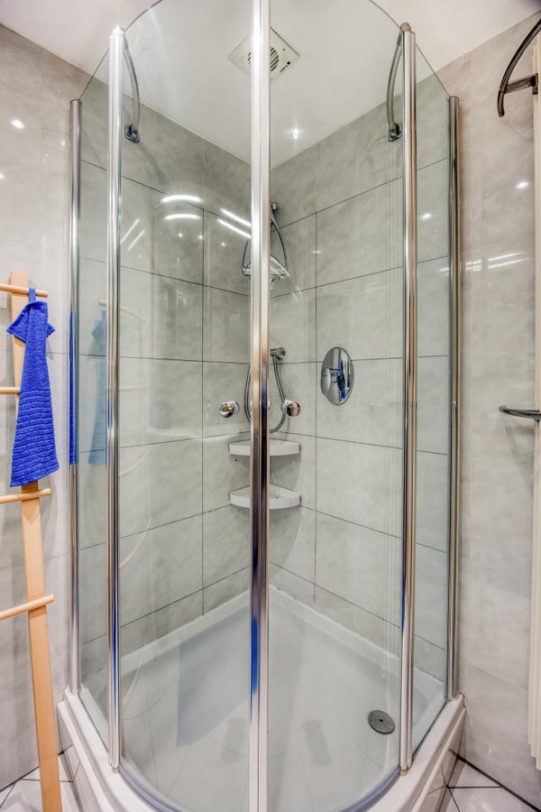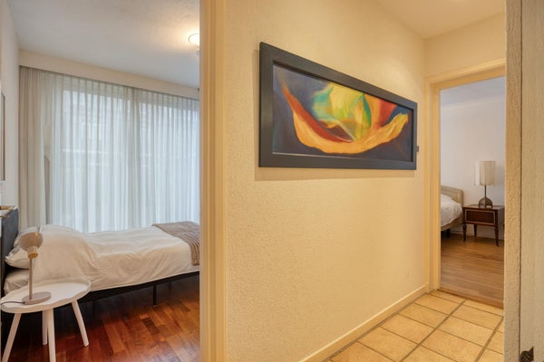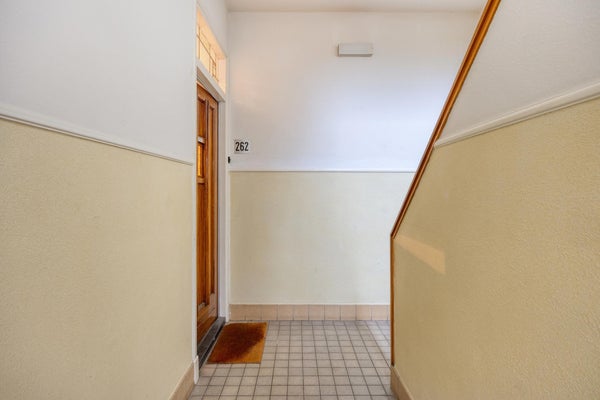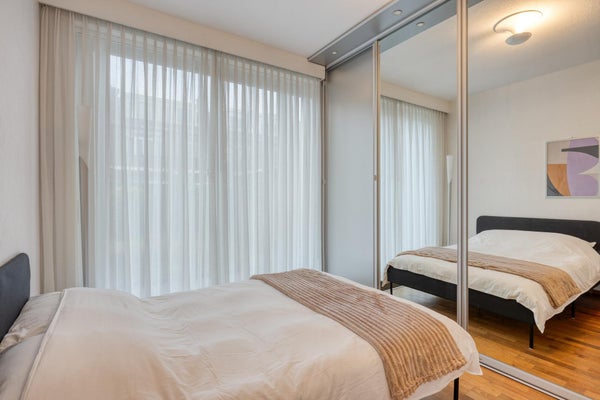 La camera da letto principale si trova sul retro dell'appartamento con porte-finestra che danno sul giardino. Anche la 2° camera da letto si trova sul retro con porte-finestra che danno sul giardino. Grandi armadi a muro in entrambe le camere da letto. La camera sul davanti è attualmente arredata come studio/spazio di lavoro domestico, ma può facilmente essere utilizzata anche come camera da letto. Bagno con doccia, lavabo con mobile e c'è un bagno separato. Nuova caldaia a gas (2026). Caratteristica di questo immobile è la posizione tranquilla e al contempo l'accessibilità alla spiaggia e a diverse opzioni di acquisto e ai mezzi di trasporto pubblico.