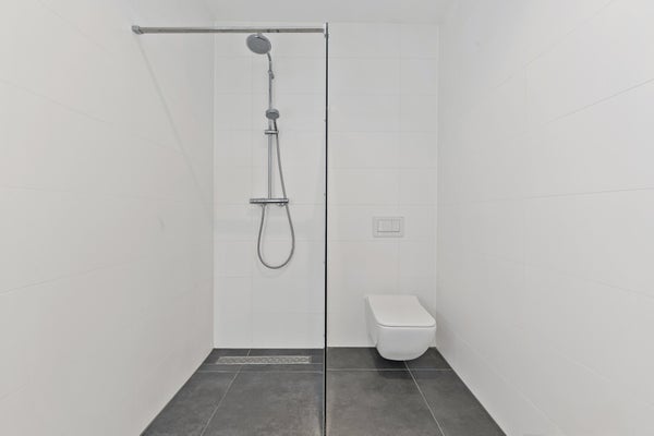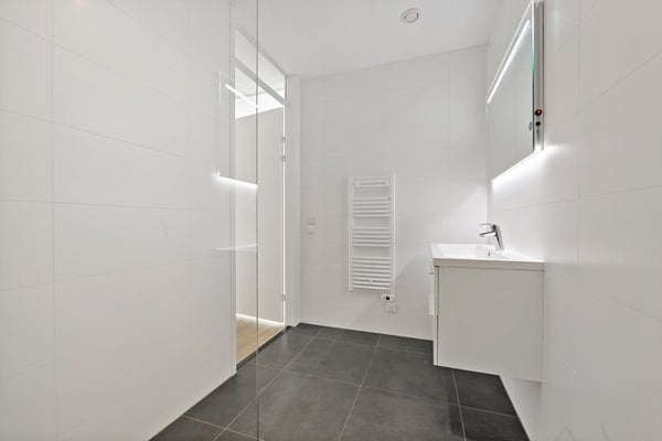Il bagno di dimensioni generose è arredato con gusto e presenta un mobile lavabo moderno, una spaziosa doccia walk-in, un secondo WC e un radiatore per asciugamani di design - uno spazio elegante e confortevole per iniziare o terminare la tua giornata.