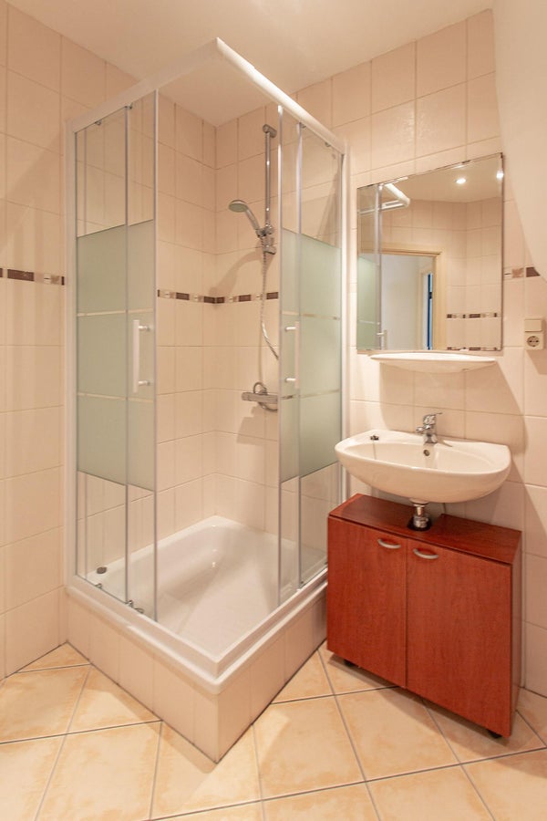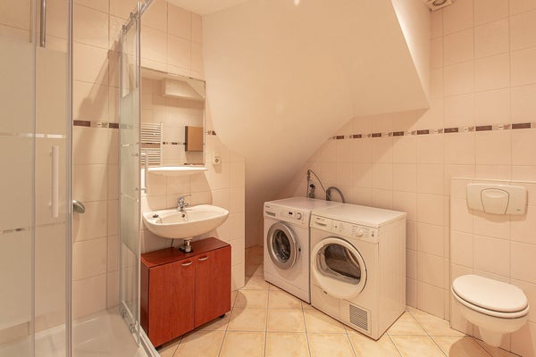 Il bagno è arredato in modo pratico con un WC, una doccia a filo pavimento, un lavabo e una lavatrice e asciugatrice.