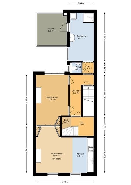 Ingresso - con le scale si accede al primo piano, camera da letto, soggiorno con angolo cottura - nel corridoio si trovano il bagno separato e il bagno. Dal bagno si accede al balcone.