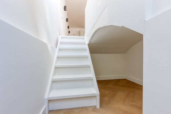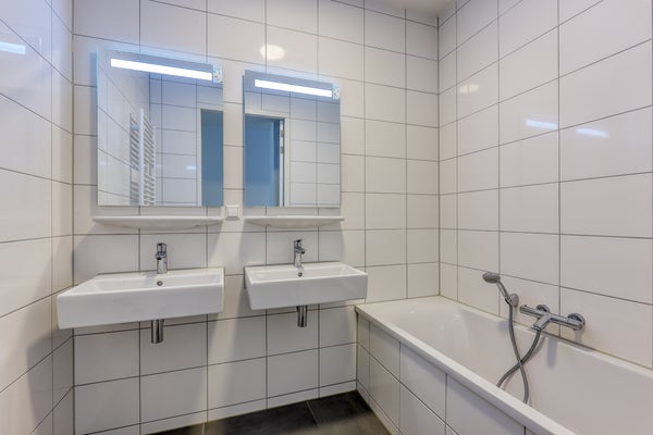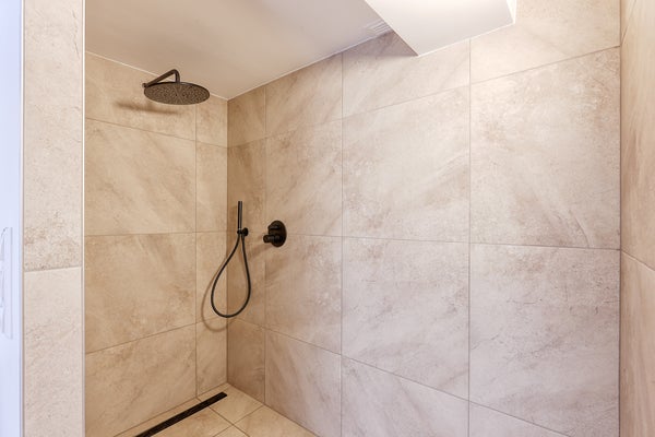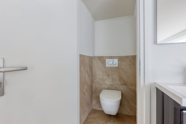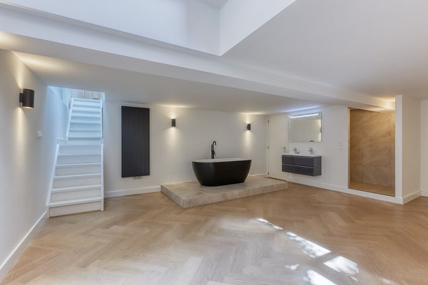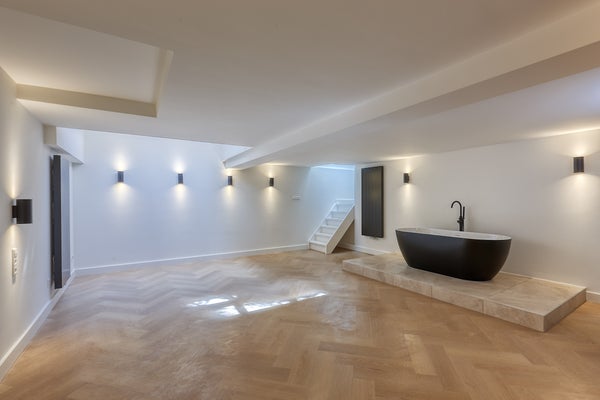 L'appartamento dispone di due camere da letto. La camera principale, situata nel seminterrato, è un'oasi di tranquillità con una vasca da bagno di design autoportante, doccia separata e toilette. La seconda camera si trova al piano terra, nella parte anteriore della casa. Su questo piano troverai anche il secondo bagno, dotato di vasca da bagno e doppio lavabo, oltre a un wc separato sospeso con lavandino.