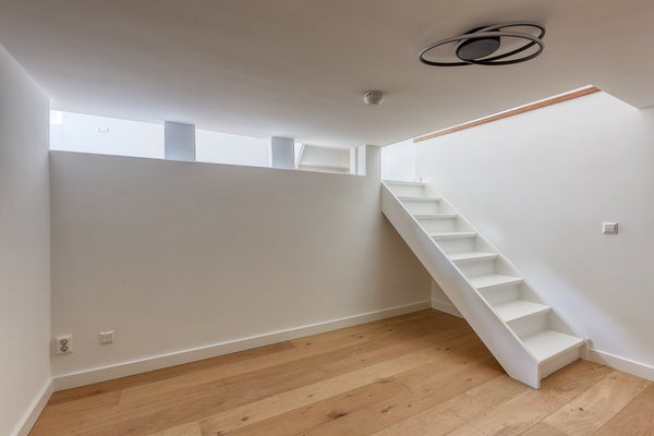 Una piccola scala dal soggiorno porta a un ulteriore spazio ideale come sala TV o ufficio domestico.