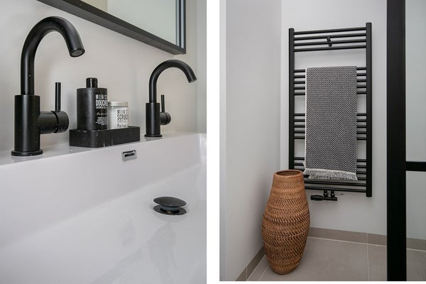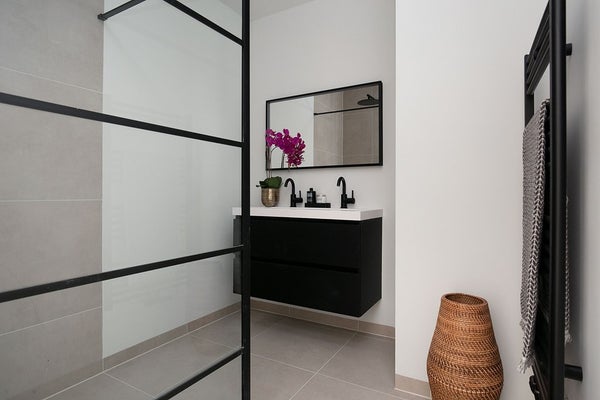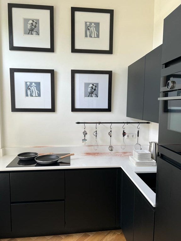 Ingresso comune con scale che portano al primo piano. Hall con toilet separato, accesso alla prima camera da letto, camera da letto principale, bagno, toilet separato e soggiorno. Ampio e luminoso soggiorno con zona pranzo e cucina aperta moderna, di design nero. La cucina è dotata di un piano cottura a induzione di qualità e lavello. Grande muro armadio con frigorifero/congelatore integrato, forno Siemens, lavastoviglie. Il balcone è accessibile attraverso la camera da letto. Lussuoso bagno con doccia a filo, lavabo con cassetti per riporre, specchio e radiatore per asciugamani.