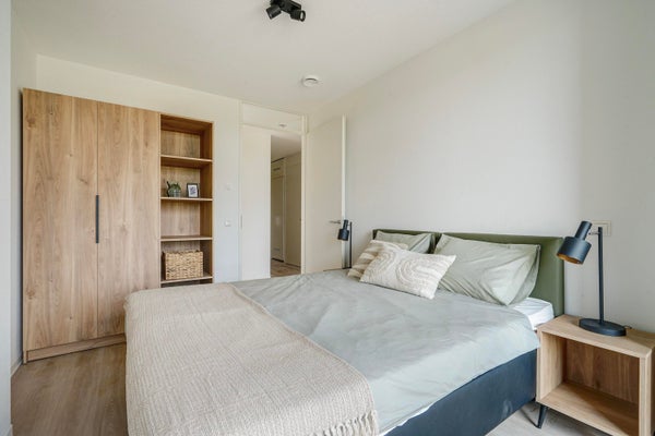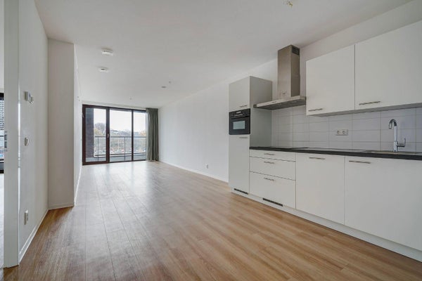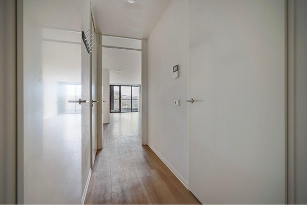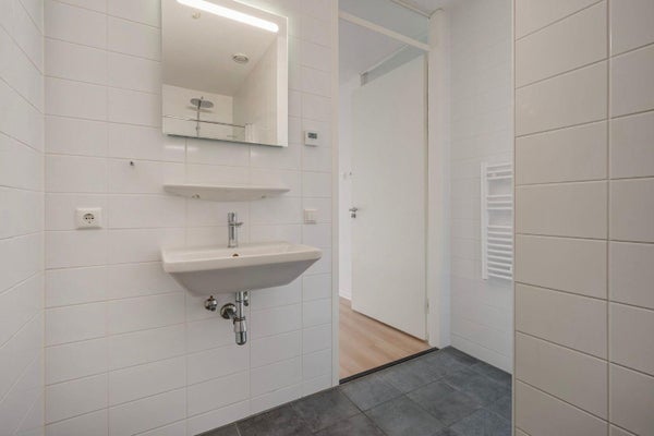 Entro in questo luminoso appartamento bilocale tramite l'ingresso. Da qui, accedi al spazioso soggiorno con cucina a vista. La cucina è dotata di tutti i moderni elettrodomestici integrati. Grazie alle grandi finestre dal pavimento al soffitto, entra molta luce naturale e puoi goderti una sensazione di ampiezza. Apri la porta verso l'esterno e vivi la meravigliosa vista sullo skyline de L'Aia dal tuo spazio esterno.