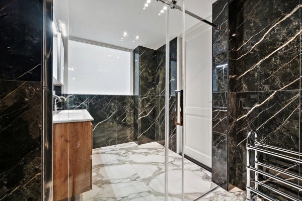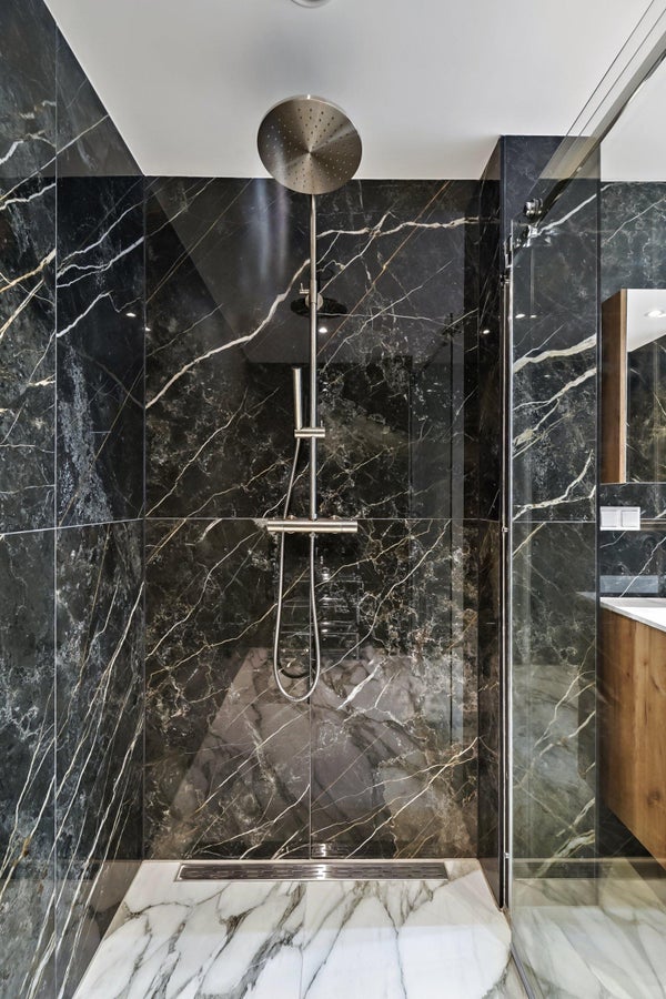 Accanto alla cucina si trova il bagno, dotato di doccia a pioggia, mobile lavabo e radiatore per asciugamani.