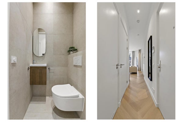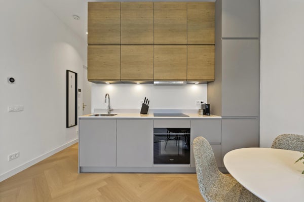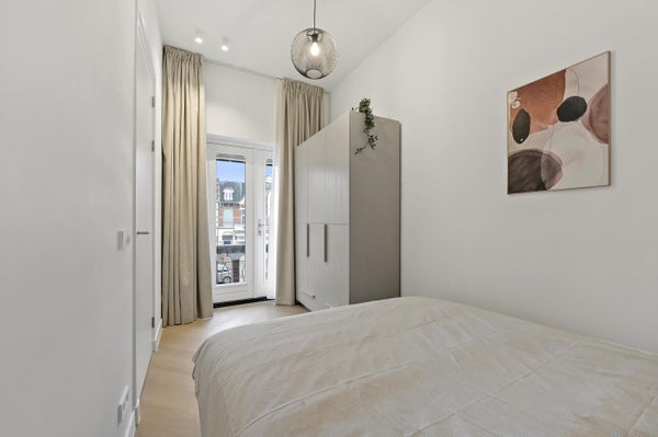 Entrata a livello stradale, porta principale. Scale fino al primo piano. Porta d'ingresso dell'appartamento. Corridoio con accesso a tutte le stanze. Il soggiorno è situato nel fronte dell'appartamento ed è molto luminoso. Ciò che colpisce immediatamente è la bella finestra ad angolo, il balcone situato a sud-ovest (accessibile tramite il soggiorno e la camera da letto), l'arredamento elegante e la cucina aperta con piano di lavoro in composito, completamente attrezzata per tutte le comodità. Pensate a un lussuoso rubinetto per acqua calda Quooker, a una combinazione forno-microonde Siemens, a un frigorifero, alla lavastoviglie e a un piano cottura a induzione con estrazione. L'abitazione è inoltre dotata di un pavimento in PVC a spina di pesce ed è riscaldata (e raffreddata!) tramite una pompa di calore. In breve, comfort in forma ottimale!