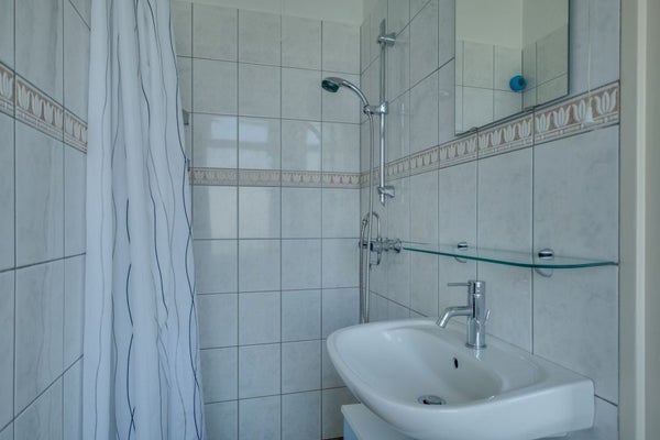 Entrata, bagno separato con lavandino, armadio a muro, cucina con accesso al primo balcone. La cucina è dotata di frigorifero, congelatore e lavastoviglie. Inoltre, il corridoio fornisce accesso al luminoso soggiorno e a una delle camere da letto, che dà accesso al secondo balcone. La seconda camera da letto si trova sul retro. Il bagno è dotato di doccia, lavabo e attacco per la lavatrice. L'appartamento è dotato di pavimento in laminato.