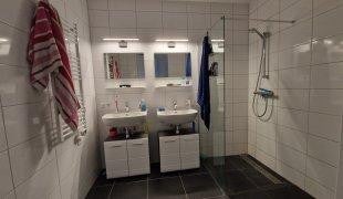 • Bagno (parzialmente) piastrellato dotato di doccia e doppio lavabo;