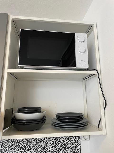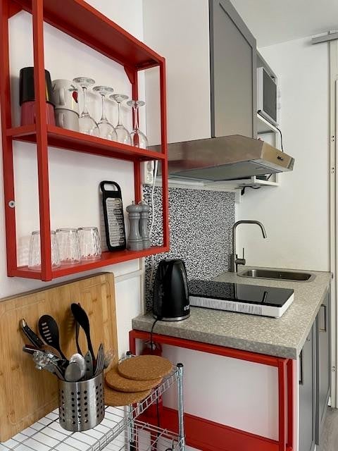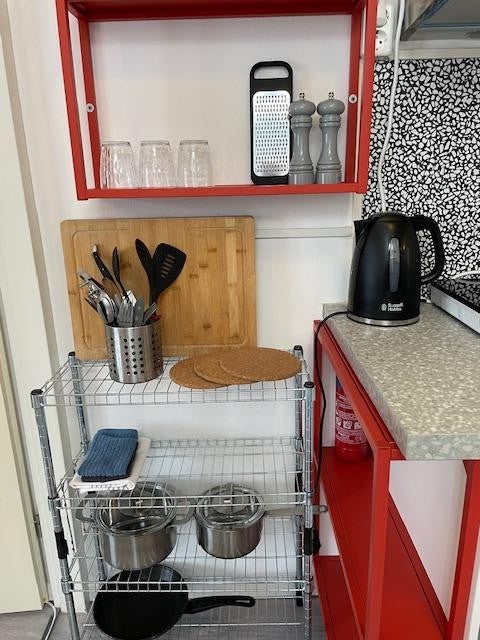 Nel disimpegno si trova il piccolo ma completo angolo cottura con stoviglie e apparecchi.
