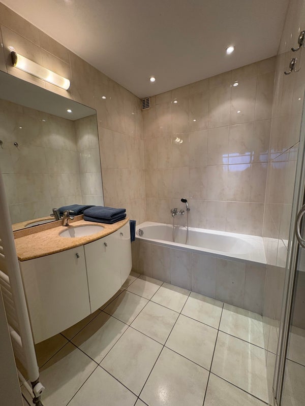 Ampio bagno completamente piastrellato con vasca, doccia e lavabo.