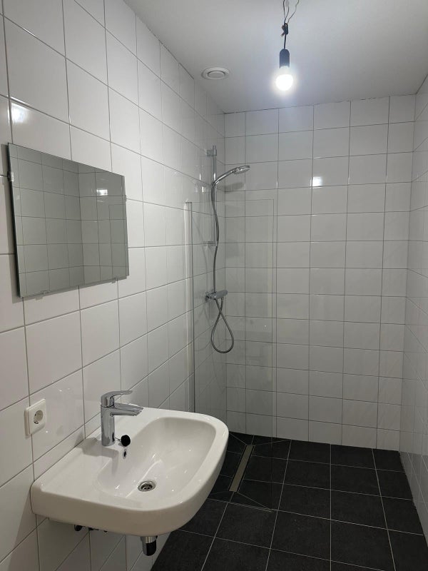 Il bagno è rifinito e attrezzato con doccia a filo pavimento, lavabo e specchio con illuminazione integrata. Il riscaldamento avviene tramite un'unità di riscaldamento a risparmio energetico. Le foto nell'annuncio sono state scattate durante la ristrutturazione.