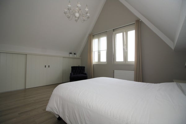 Disimpegno con accesso a 2 camere da letto, il bagno e la stanza tecnica di circa 4 m2, con spazio per la lavatrice e l'asciugatrice. La spaziosa camera da letto principale di circa 21 m2 davanti ha alti soffitti inclinati. Una seconda camera da letto di circa 14 m2 sul retro ha anche alti soffitti inclinati. Il bagno completamente attrezzato è dotato di una doccia a pioggia, una vasca da bagno, un WC a parete, un mobile lavabo e un radiatore di design. Dalla piccola camera da letto si accede a un ripostiglio, accessibile tramite una scala. Lo spazio è adatto sia per la conservazione che per l'accoglienza di ospiti. Entrambe le camere da letto dispongono di armadi a muro integrati nella pendenza e offrono sezioni sia per appendere che per riporre.
