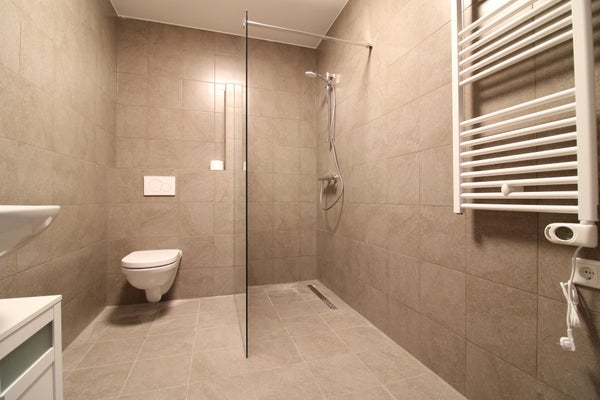 Il bagno moderno è realizzato in una palette di colori grigi senza tempo ed è dotato di lavabo con mobile, doccia open space, secondo WC e radiatore di design.