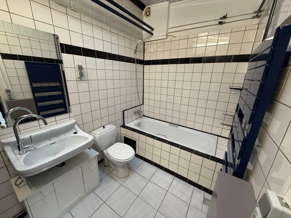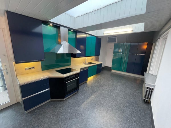 Dalla porta d'ingresso si accede a un piccolo ingresso che tramite la scala porta all'appartamento. Il soggiorno spazioso è dotato di pavimenti in laminato. Dal soggiorno si accede alla cucina chiusa. Questa cucina ben tenuta è dotata di piano cottura elettrico, cappa aspirante, forno, lavastoviglie, frigorifero e piano di lavoro con spazio per armadi.