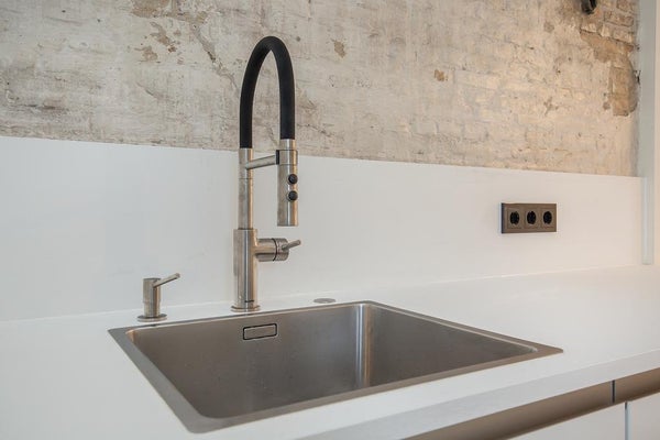 Una volta raggiunto il primo piano, verrai accolto da una chic porta scorrevole in vetro. Questo ti conduce alla nuovissima cucina. La cucina è dotata di piano cottura a induzione con estrazione interna, combinato frigo-congelatore, lavastoviglie, forno, microonde e molto spazio di stoccaggio. Il muro in pietra mantenuto sopra il moderno piano di lavoro conferisce un contrasto accogliente.