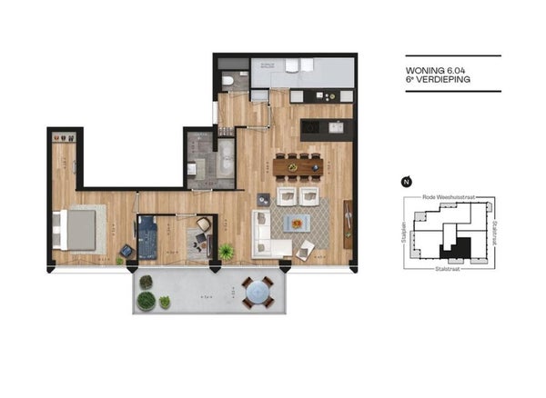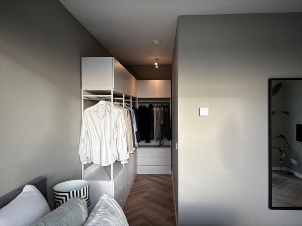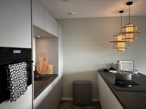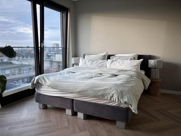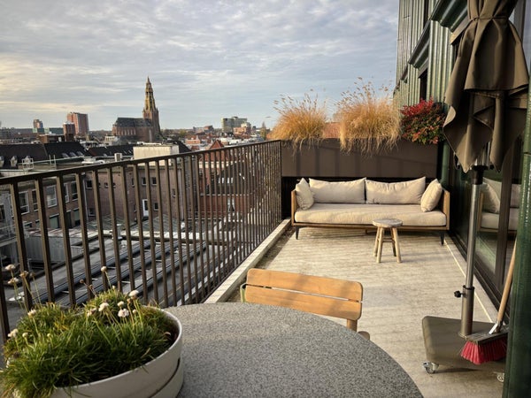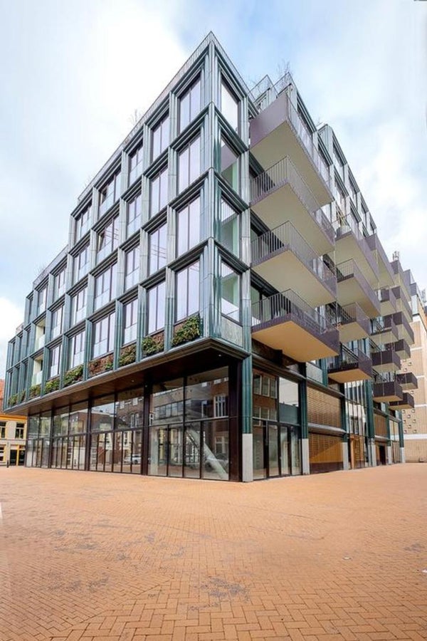 L'appartamento al 6° piano ha un ingresso con bagno, un ampio soggiorno di circa 47 m² con cucina a vista attrezzata con elettrodomestici moderni. Ha accesso a un balcone di 16 m² con vista libera sulla città e sulla Martinitoren. L'appartamento include due camere da letto e un elegante bagno con doccia a filo. Il riscaldamento a pavimento e il pavimento in PVC aggiungono comfort.
