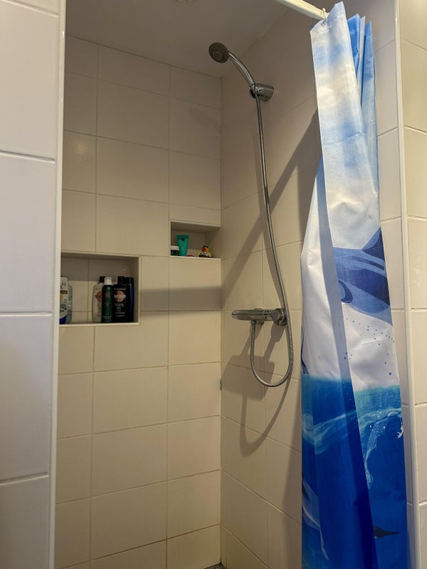 Dietro il bagno c'è un ripostiglio con la lavatrice, tra le altre cose.