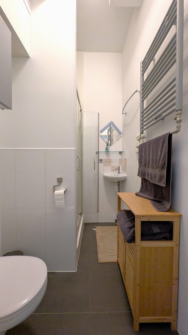 La camera da letto separata di circa 10 m² è adatta per un letto matrimoniale e un armadio. Il bagno è compatto ma arredato in modo pratico.