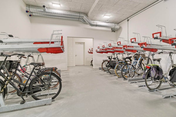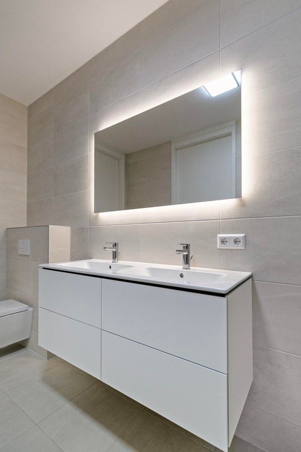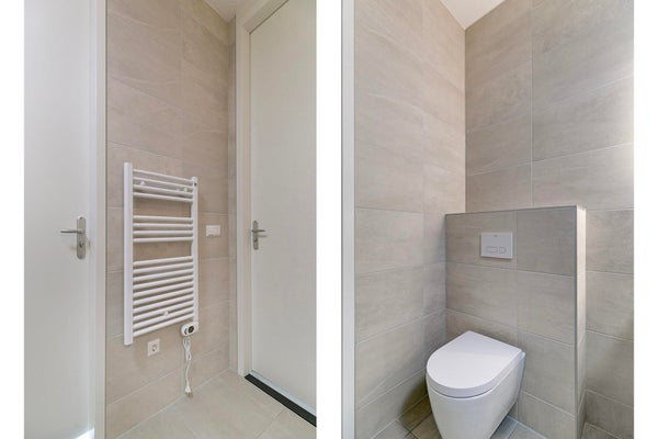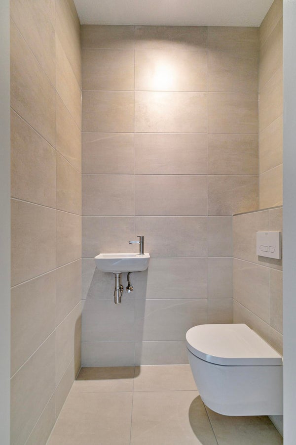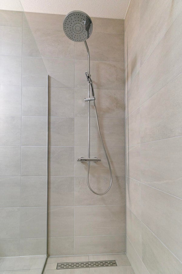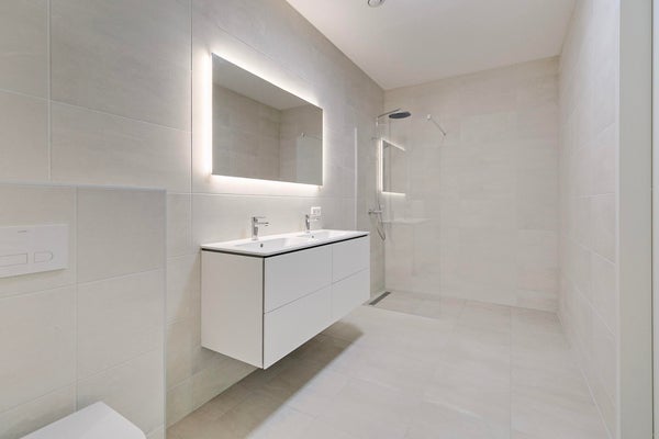 Il bagno, decorato con gusto, è dotato di una doccia a filo pavimento, lavabo doppio e un secondo wc. La camera tecnica ha spazio per una lavatrice e asciugatrice. Nel seminterrato dell'edificio c'è un deposito e c'è anche un deposito per biciclette.