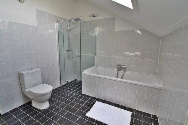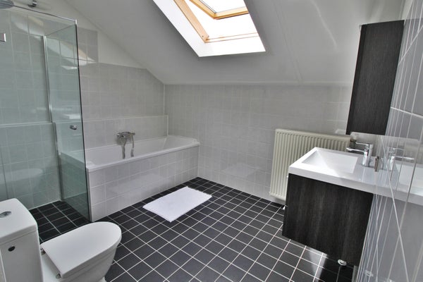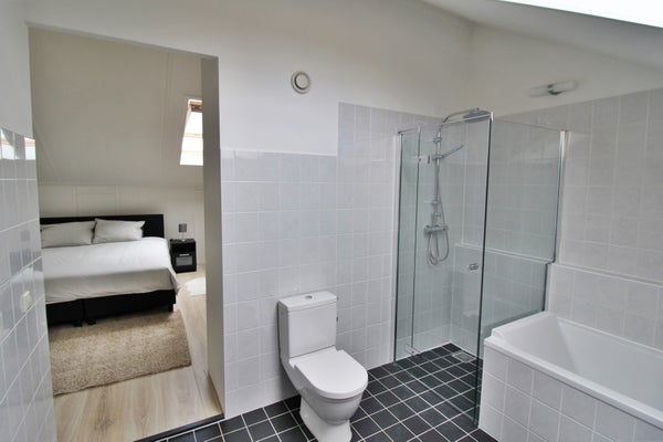 5th floor: spacious landing with access to storage space. Second bedroom with en-suite bathroom. Bathroom with bath, shower, second toilet and washbasin with furniture. In the bedroom there is also access to various indoor storage compartments (under the sloping hood).
