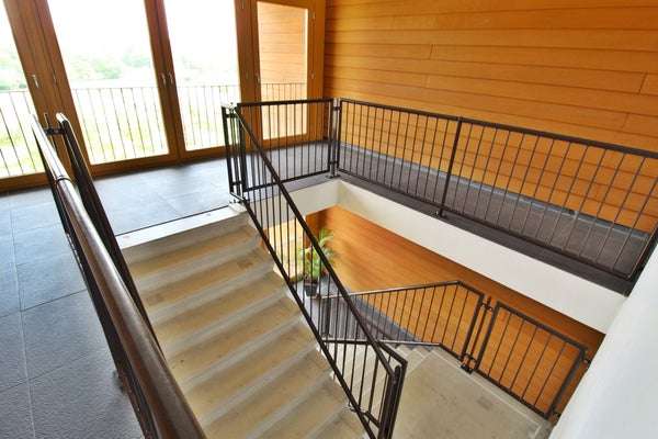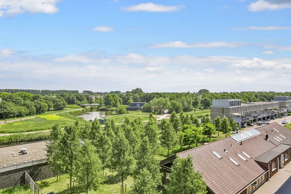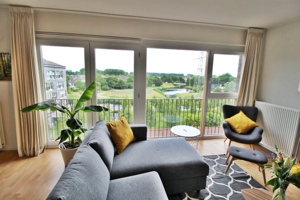 4th floor: entrance to the house. Hall with meter cupboard, spacious toilet (with fountain) and technical room with washing machine and central heating boiler. Huge living room with large glass front, making the living room wonderfully bright. From the living room there is a beautiful view over the greenery in the area. Spacious open kitchen with bar set-up. Kitchen with built-in appliances such as a dishwasher, fridge-freezer, gas stove and built-in oven. Next to the kitchen is the first bedroom. Access to the 5th floor via a fixed open staircase in the living room.