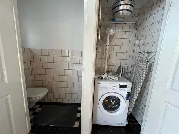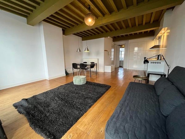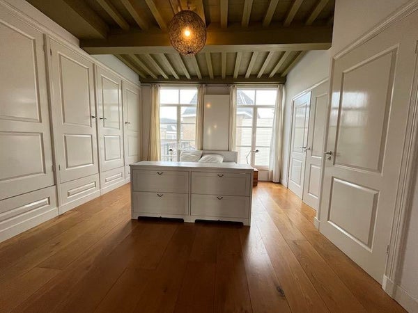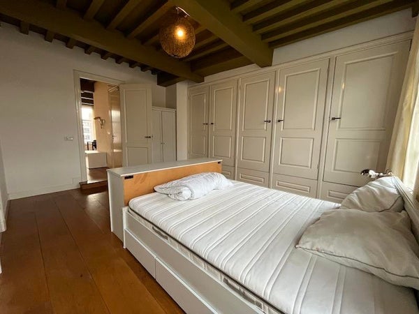 Layout: Stairs to the first floor. Spacious and bright living room with oak floors and a modern open kitchen equipped with all amenities. Characteristic high beamed ceilings throughout. Very spacious bedroom, with build in cupboards. Bathroom with a walk-in shower and a sink. Separate toilet and separate place to install the washing machine.