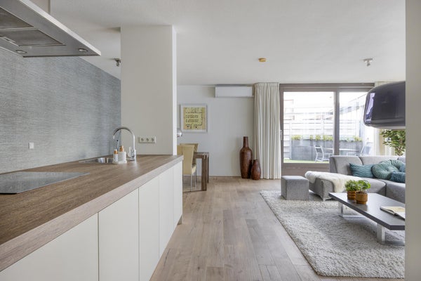 Dal soggiorno si accede alla spaziosa terrazza sul tetto, dove si può godere tranquillamente della vista sulla Mosa e l'ambiente vivace del Mosae Forum.