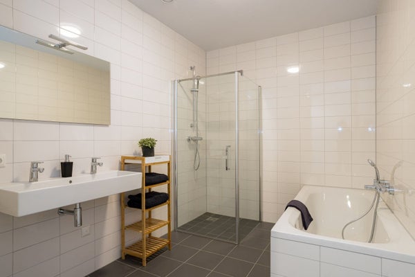 Questo appartamento (con due camere da letto) viene consegnato vuoto. Hai quindi la libertà di arredare la casa completamente secondo il tuo stile personale! Tutte le abitazioni dispongono di una cucina di lusso con apparecchi moderni (frigorifero, congelatore, forno combinato, lavastoviglie) e un bagno elegante con vasca e doccia separata.