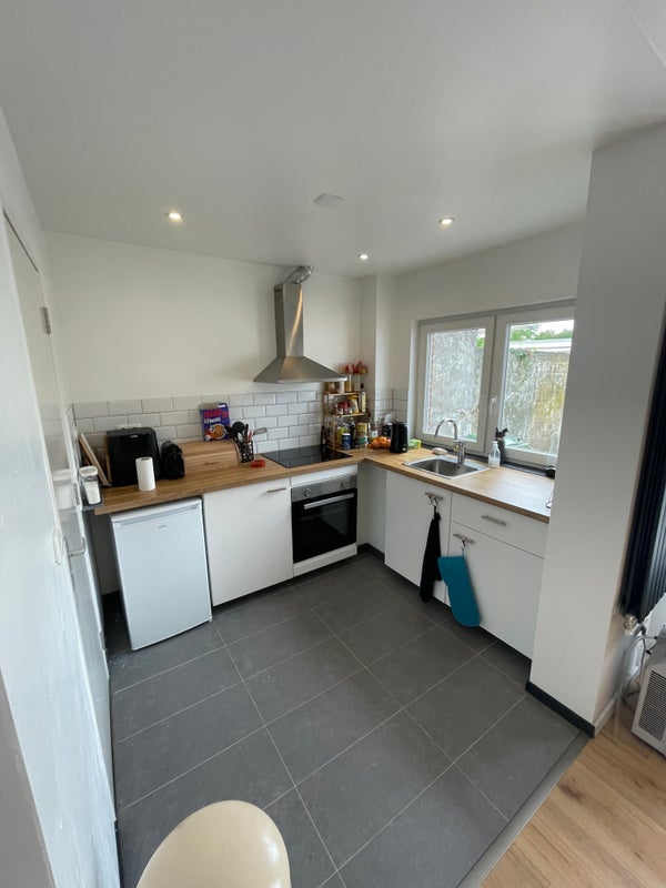 La cucina è attrezzata con piano cottura a induzione, combinazione frigorifero/congelatore e cappa.