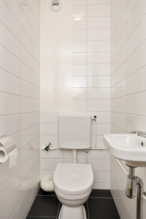 Corridoio con wc piastrellato dotato di wc e lavabo.