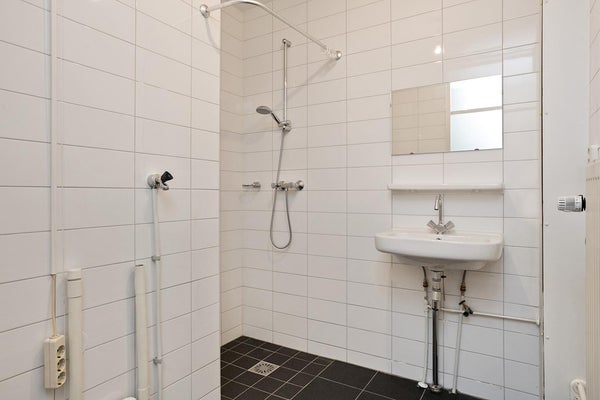 Bagno completamente piastrellato (2.08 x 1.63 m) fornito di lavandino, doccia e punto di connessione per lavatrice.