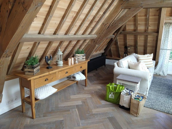 Questo loft recentemente ristrutturato si trova in una strada tranquilla e offre una sensazione di spazio grazie al soffitto alto con le travi e le travi a vista.