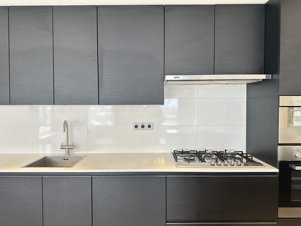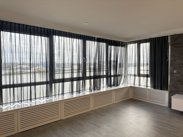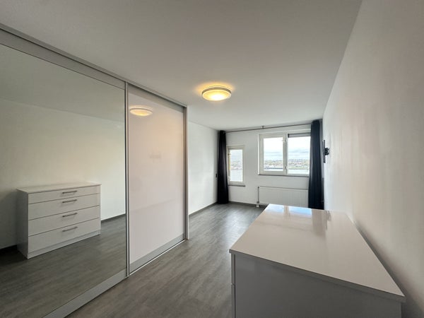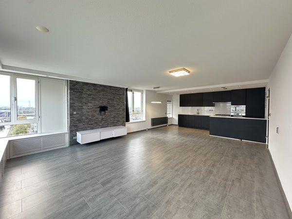 Distribuzione: 10° pianoQuesto appartamento moderno e parzialmente arredato si trova al 10° piano e dispone di tre camere, tra cui un ampio soggiorno con cucina a vista e due camere da letto. Il soggiorno è notevolmente luminoso grazie alle ampie vetrate che consentono l'ingresso di molta luce naturale e offrono una vista mozzafiato sul fiume Maas e sullo skyline di Rotterdam. Lo spazio è rifinito in modo elegante, dotato di un moderno mobile per TV e offre molte possibilità di personalizzazione. La cucina a vista si integra perfettamente nel soggiorno e ha un aspetto moderno grazie ai mobili neri con piano di lavoro bianco. La cucina è attrezzata con vari elettrodomestici integrati, tra cui forno, microonde, lavastoviglie, frigorifero, piano cottura a gas e cappa aspirante. Inoltre è presente un pratico bancone che offre ulteriore spazio di lavoro e crea una naturale separazione tra cucina e soggiorno. La camera da letto 1 è spaziosa e dotata di un grande armadio con porte scorrevoli e un comò. Da questa camera si gode anche una bella vista sulla Maas. La camera da letto 2 dispone di una finitura e di uno spazio armadio simili e può servire perfettamente come camera per gli ospiti o studio. Il bagno è modernamente arredato con una spaziosa doccia a filo, un mobile lavabo e un termosifone di design. Il bagno separato è rifinito con le stesse eleganti tonalità di grigio. Il corridoio è spazioso e curato, dotato di diverse porte per le varie stanze, un citofono video e una rifinitura ordinata in tonalità grigio-bianco.
