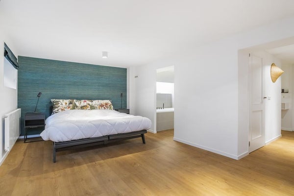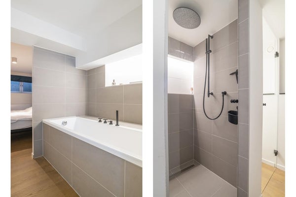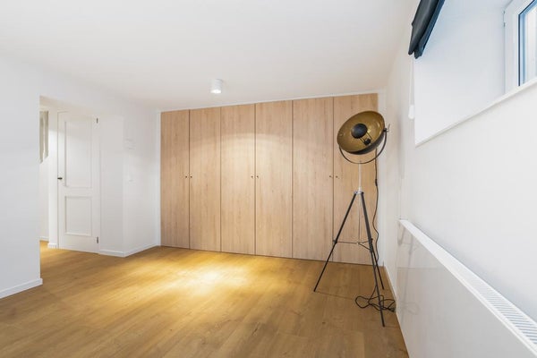 Puoi prendere le scale dal soggiorno al piano terra, dove si trovano la 3a camera da letto e il secondo bagno lussuoso. Qui troviamo anche un secondo wc e un guardaroba.