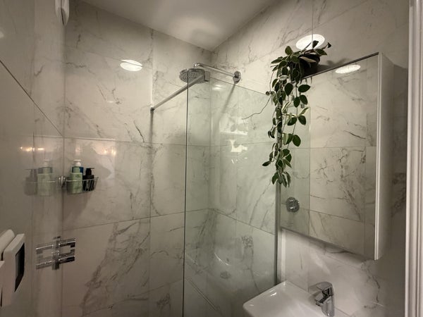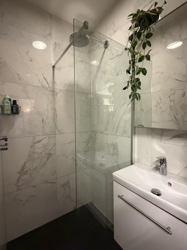 equipaggiato con una doccia walk-in, un lavabo con mobile e uno specchio. Servizi igienici separati disponibili, anch'essi accessibili dal corridoio. Inoltre, c'è un armadio di stoccaggio separato.