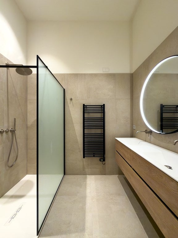 Bagno: Il bagno è un vero colpo d'occhio, con finiture di lusso e una disposizione confortevole. La grande doccia a filo offre una doccia a pioggia moderna, perfetta per rilassarsi dopo una lunga giornata. Inoltre, il bagno dispone di un lavabo con un bel mobile. La finitura con piastrelle grandi e l'arredamento elegante rendono questo spazio una vera oasi di tranquillità.