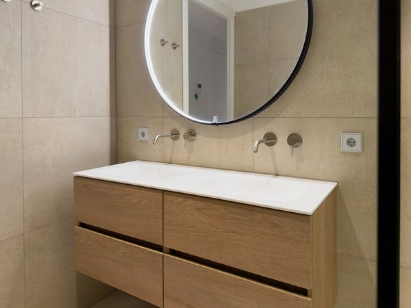 Bagno: Il bagno moderno è arredato con gusto con una spaziosa doccia a filo pavimento con doccia a pioggia, un lavabo con un bel mobile e una vasca da bagno. Le finiture con grandi piastrelle e l'arredamento elegante creano un'atmosfera rilassante.