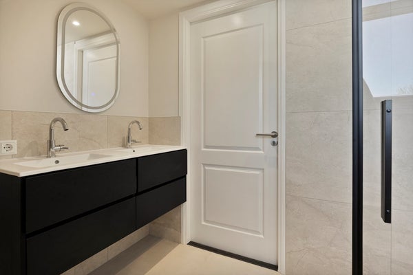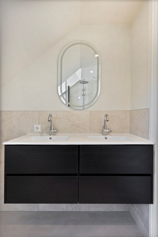 Il nuovo e lussuoso bagno è dotato di un doppio lavabo con mobile e specchio illuminato, una cabina doccia con doccia a pioggia e un wc sospeso.