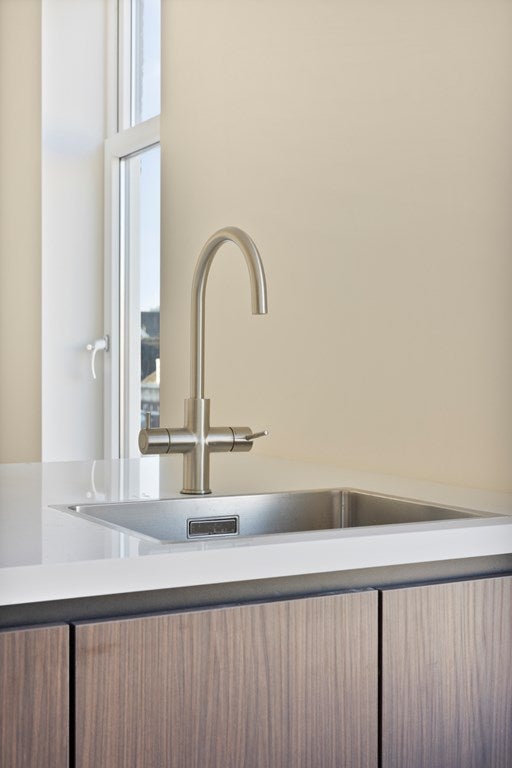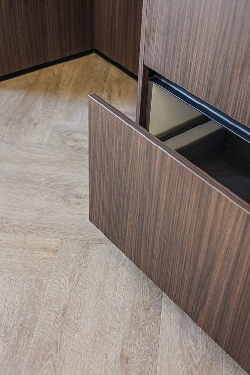La bellissima nuova cucina è davvero un colpo d'occhio ed è completamente attrezzata con moderni elettrodomestici, tra cui frigorifero, congelatore, lavastoviglie, forno combinato e piano cottura a induzione con estrazione integrata. Il piano di lavoro spazioso offre sufficiente spazio per cucinare e c'è anche ampio spazio di archiviazione grazie ai numerosi armadi.