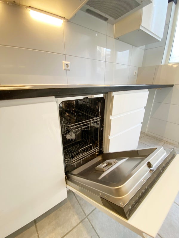 La cucina moderna è dotata di elettrodomestici incassati, tra cui lavastoviglie, grande frigorifero-congelatore, cappa aspirante e piano cottura a induzione. C'è anche spazio sotto il piano di lavoro per una lavatrice.