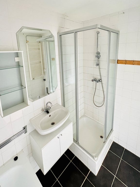 Il bagno completamente piastrellato è dotato di vasca, doccia separata e lavabo con specchio.