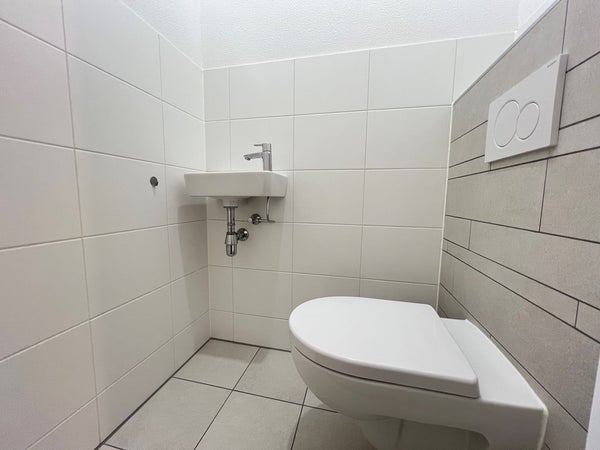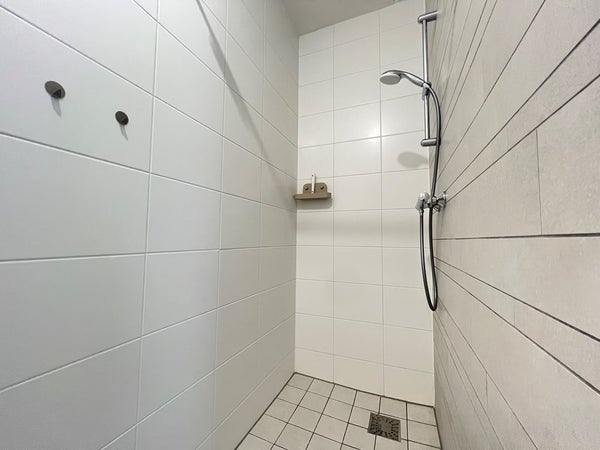 La spaziosa camera da letto offre ample spazio per un letto matrimoniale e un armadio. Il moderno bagno è dotato di doccia a pavimento, lavabo con specchio e radiatore per asciugamani. C'è anche un bagno separato con un WC a parete (sospeso) e un piccolo lavabo. Dal corridoio si accede al ripostiglio interno dove c'è abbastanza spazio per una lavatrice e un'asciugatrice. C'è anche spazio per un scaffale di stoccaggio e un congelatore.
