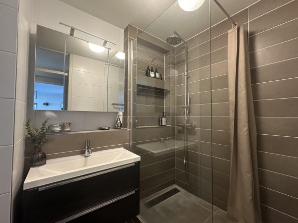 Il moderno bagno è arredato con gusto e dotato di una doccia walk-in con doccia a pioggia e doccia a mano, e un elegante mobile lavabo e uno specchio illuminato.