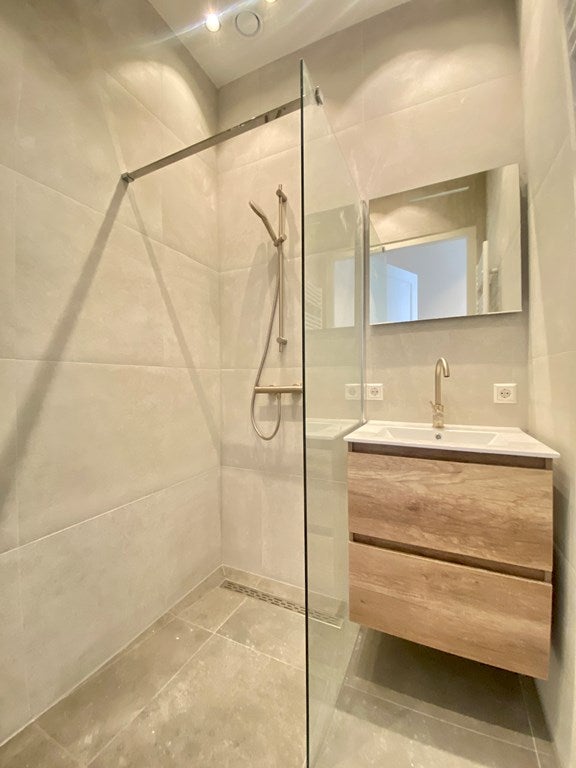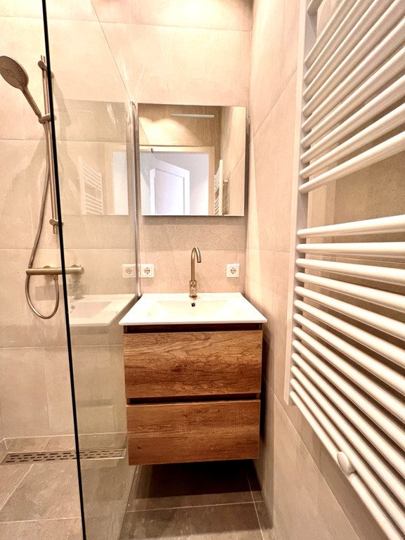 Entrambi i bagni sono dotati di doccia, lavabo con specchio e radiatore per asciugamani.
