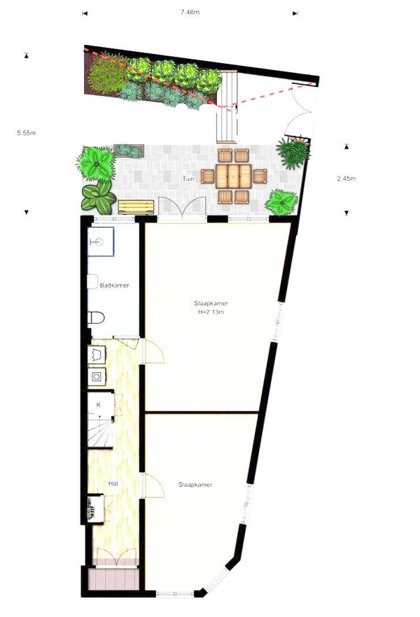 L'appartamento dispone di due camere da letto: una grande camera da letto principale con accesso diretto al giardino privato e una seconda camera da letto che può essere utilizzata anche come camera da letto completa. L'appartamento include ulteriormente un elegante bagno con doccia a filo pavimento e lavandino, e un WC separato.