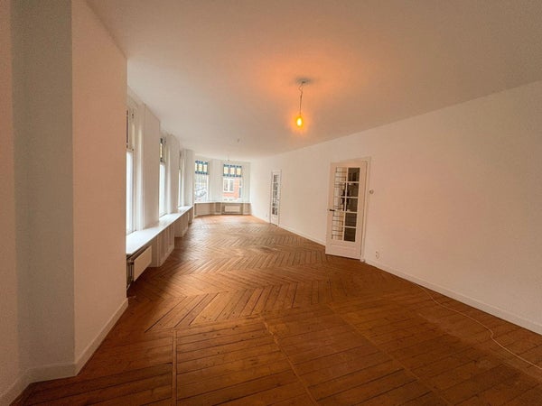 L'appartamento offre un soggiorno molto spazioso e luminoso, con un bellissimo pavimento in legno a spina di pesce, ampie finestre e splendidi dettagli in vetro colorato. Queste finestre in vetro colorato originali creano una luce calda e atmosferica e conferiscono un carattere affascinante e distintivo allo spazio.