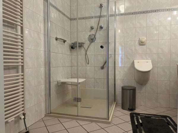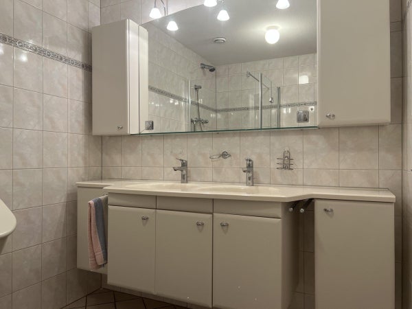 L'appartamento dispone di due camere da letto, entrambe con ampie possibilità. Il bagno è progettato in una palette di colori neutri ed è dotato di doccia, radiatore per asciugamani, doppio lavabo e urinario.