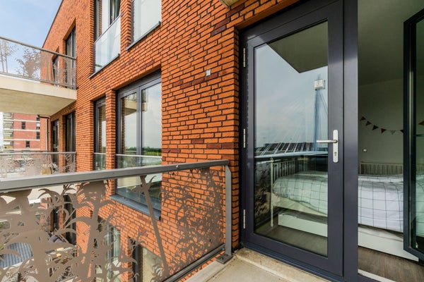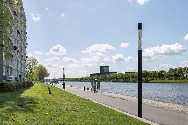 Entrata, corridoio centrale con armadietto contatore, bagno moderno con doccia a filo pavimento, lavabo e armadio a muro, ampio ripostiglio con spazio per la lavatrice, ventilazione meccanica e spazio sufficiente per posizionare eventualmente un congelatore aggiuntivo. Toilette separata con lavabo. Ampia camera da letto anteriore con accesso a un delizioso balcone soleggiato con vista libera sul canale Amsterdam-Reno.